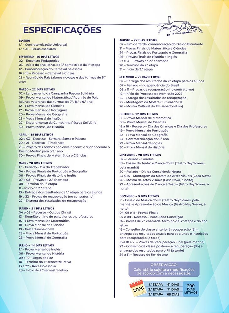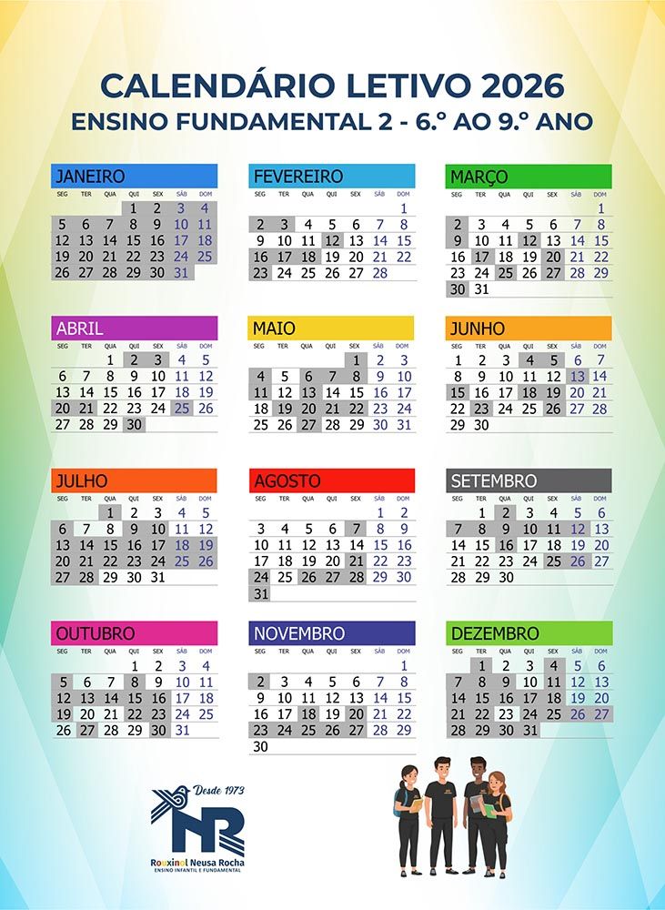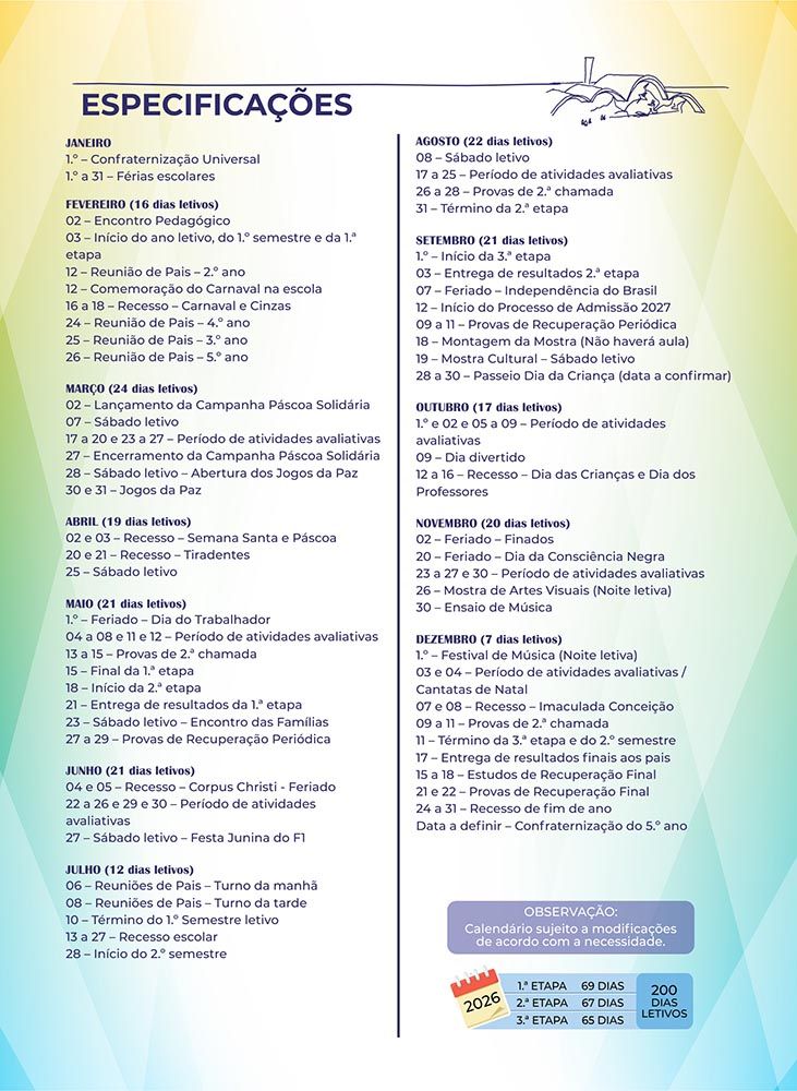 O calendário escolar traz os dias letivos e as principais datas comemorativas estabelecidas para o ano letivo.
