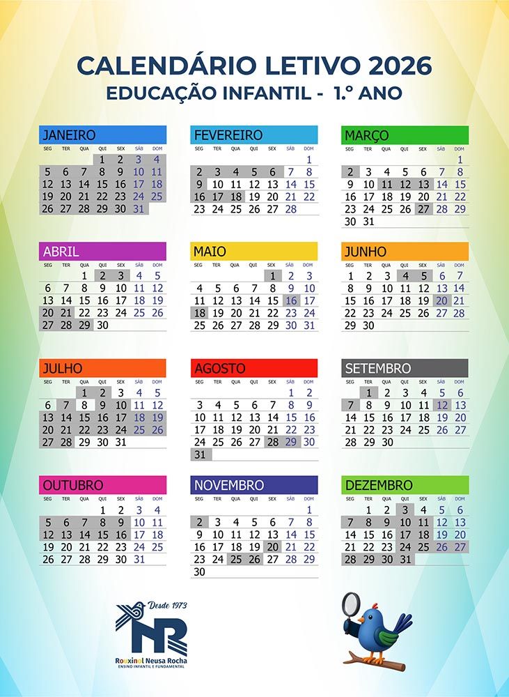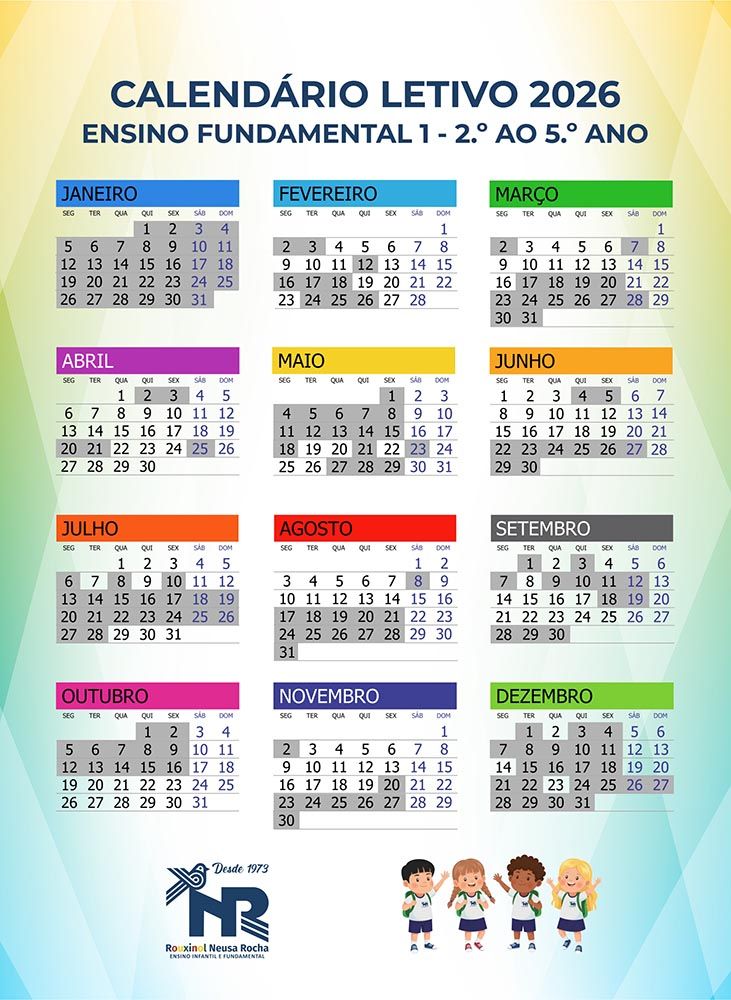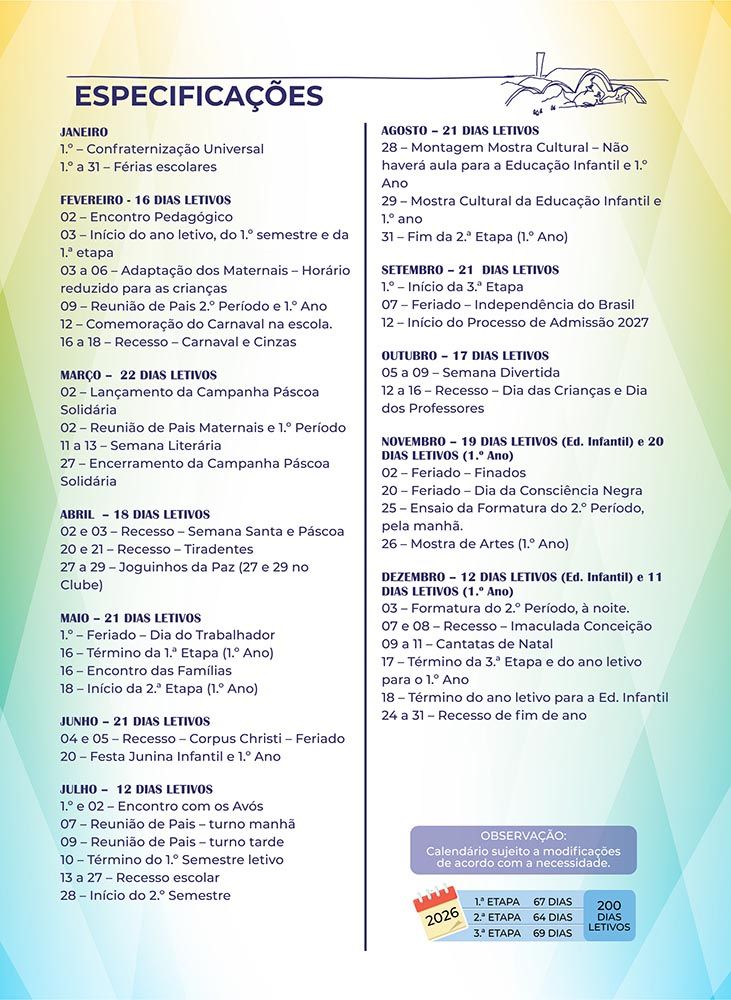 O calendário escolar traz os dias letivos e as principais datas comemorativas estabelecidas para o ano letivo.